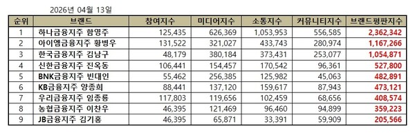 금융지주회사 CEO 브랜드평판 2026년 4월 순위는 하나금융지주 함영주, 아이엠금융지주 황병우, 한국금융지주 김남구, 신한금융지주 진옥동, BNK금융지주 빈대인, KB금융지주 양종희, 우리금융지주 임종룡, 농협금융지주 이찬우, JB금융지주 김기홍 순이었다.