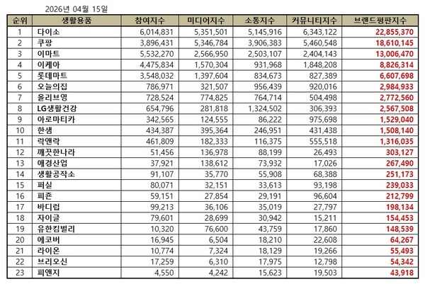 한국기업평판연구소는 생활용품 23개 브랜드에 대해 2026년 3월 15일부터 2026년 4월 15일까지의 생활용품 브랜드 빅데이터 84,576,984개를 분석한 결과 지난 3월 생활용품 브랜드 빅데이터 55,970,092개와 비교하면 51.11% 증가했다고 밝혔다.