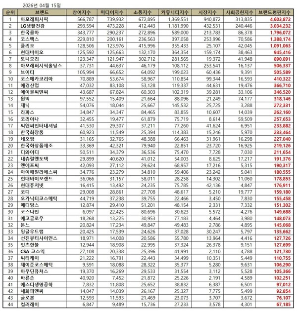 화장품 상장기업 2026년 4월 브랜드평판...아모레퍼시픽, LG생활건강, 한국콜마 順