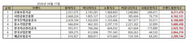 2026년 4월 금융위원회 공공기관 브랜드평판 순위는 신용보증기금, 서민금융진흥원, 한국주택금융공사, 중소기업은행, 한국자산관리공사, 한국산업은행, 예금보험공사 순이었다.