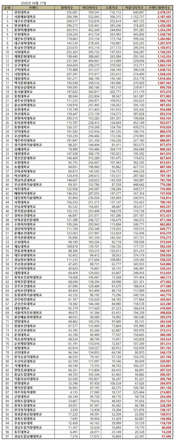 2026년 4월 전문대학 브랜드평판 30위 순위는 경복대학교, 서울예술대학교, 대구보건대학교, 연성대학교, 동양미래대학교, 부천대학교, 대전보건대학교, 대구과학대학교, 동남보건대학교, 서정대학교, 계명문화대학교, 경민대학교, 신구대학교, 구미대학교, 서일대학교, 대림대학교, 백석문화대학교, 한림성심대학교, 동서울대학교, 충청대학교, 광주보건대학교, 울산과학대학교, 유한대학교, 안산대학교, 한양여자대학교, 동의과학대학교, 동원대학교, 인덕대학교, 오산대학교, 제주한라대학교, 경기과학기술대학교 순으로 분석됐다.