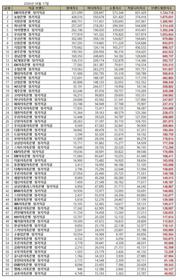 한국기업평판연구소는 61개 정기적금 브랜드에 대해 2026년 3월 17일부터 2026년 4월 17일까지의 정기적금 브랜드 빅데이터 22,291,323개를 분석한 결과 지난 3월 정기적금 브랜드 빅데이터 20,865,816개와 비교하면 6.83% 증가했다고 밝혔다.