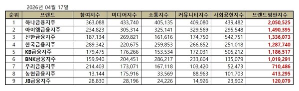 한국기업평판연구소는 2026년 3월 17일부터 2026년 4월 17일까지 금융지주회사 브랜드 빅데이터 9,614,401개를 분석하여 소비자들의 참여와 미디어, 소통, 커뮤니티, 사회공헌, 소비자지표로 금융지주회사 브랜드평판지수를 산출한 결과 지난 3월 금융지주회사 브랜드 빅데이터 9,744,044개와 비교하면 1.33% 줄어들었다고 밝혔다.