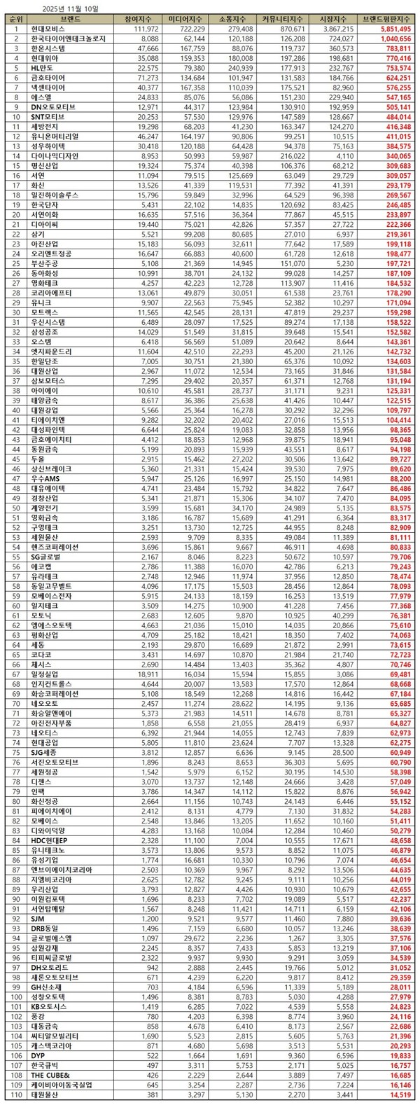 한국기업평판연구소는 국내 자동차부품 상장기업 110개 브랜드에 대해 2025년 10월 10일부터 2025년 11월 10일까지의 110개 자동차부품 상장기업의 브랜드 빅데이터 22,466,800개를 분석한 결과 지난 10월 자동차부품 상장기업 브랜드 빅데이터 23,720,247개와 비교하면 5.28% 줄어들었다고 밝혔다.