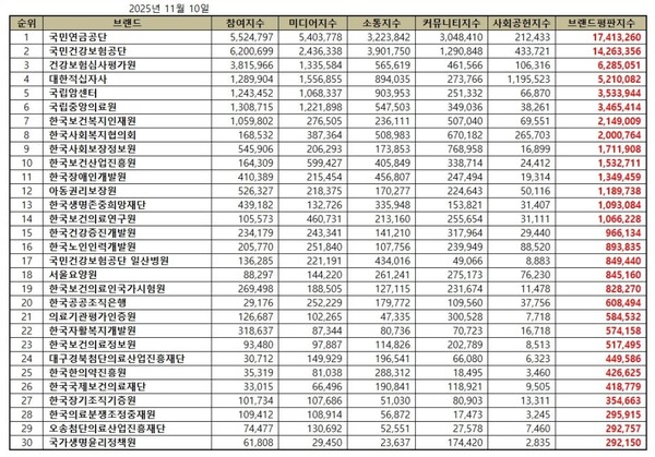 한국기업평판연구소는 보건복지부 공공기관 30개 브랜드에 대해 2025년 10월 10일부터 2025년 11월 10일까지의 보건복지부 공공기관 브랜드 빅데이터 71,461,999개를 분석한 결과 지난 10월 보건복지부 공공기관 브랜드 빅데이터 70,606,309개와 비교하면 6.79% 줄어들었다고 밝혔다.