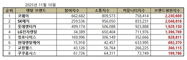 2025년 11월 렌탈 브랜드평판 빅데이터 분석 순위는 코웨이, SK매직, 롯데렌터카, LG전자렌탈, 청호나이스, 현대렌탈케어, 교원웰스, 쿠쿠홈시스 순으로 나타났다.
