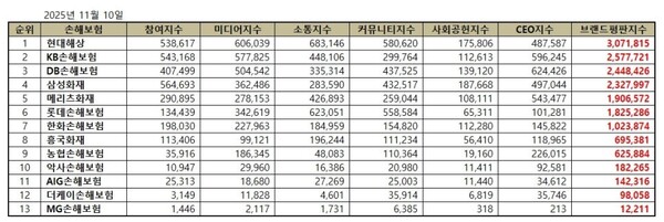 한국기업평판연구소는 2025년 10월 10일부터 2025년 11월 10일까지의 손해보험회사 브랜드 빅데이터 16,937,806개를 소비자들의 참여, 미디어, 소통, 커뮤니티, 사회공헌가치로 분류하고 평판알고리즘으로 분석하여 브랜드평판지수를 측정한 결과 지난 10월에 분석된 손해보험 브랜드 빅데이터 18,294,028개와 비교해보면 7.41% 줄어들었다고 밝혔다.