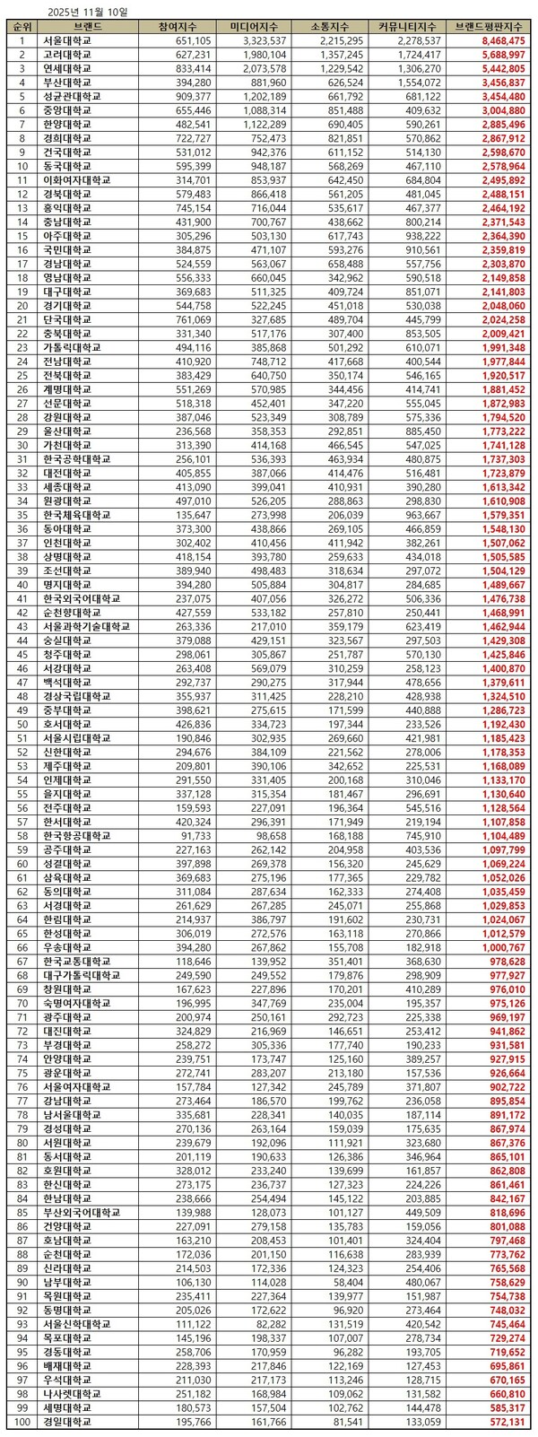 2025년 11월 대학교 브랜드평판 30위 순위는 서울대학교, 고려대학교, 연세대학교, 부산대학교, 성균관대학교, 중앙대학교, 한양대학교, 경희대학교, 건국대학교, 동국대학교, 이화여자대학교, 경북대학교, 홍익대학교, 충남대학교, 아주대학교, 국민대학교, 경남대학교, 영남대학교, 대구대학교, 경기대학교, 단국대학교, 충북대학교, 가톨릭대학교, 전남대학교, 전북대학교, 계명대학교, 선문대학교, 강원대학교, 울산대학교, 가천대학교 순으로 분석됐다.