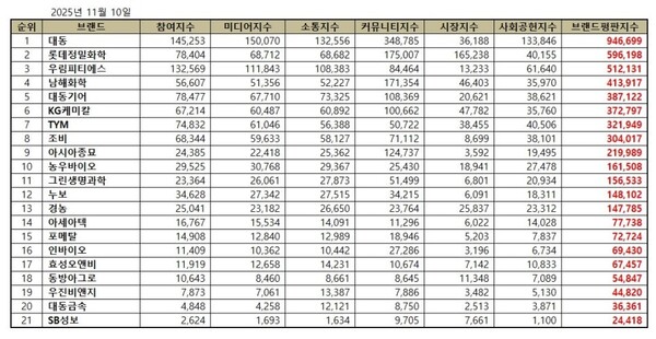 농업 상장기업 2025년 11월 브랜드평판...대동, 롯데정밀화학, 우림피티에스 順