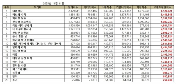 2025년 11월 드라마 브랜드평판 순위는 태풍상사, 백번의 추억, 화려한 날들, 신사장 프로젝트, 착한 여자 부세미, 다 이루어질지니, 친밀한 리플리, 은수 좋은 날, 마리와 별난 아빠들, 서울 자가에 대기업 다니는 김 부장 이야기, 달까지 가자, 마지막 썸머, 탁류, 태양을 삼킨 여자, 마이 유스, 얄미운 사랑, 퍼스트레이디, 북극성, 단죄, 층간 순으로 분석됐다.