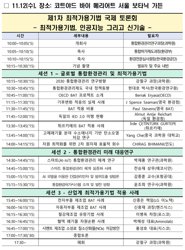송고일 : 2025-11-11[에너지신문] 기후에너지환경부 소속 국립환경과학원은 12일 코트야드 바이 메리어트 서울 보타닉파크(서울 강서구 소재)에서 ‘제1차 최적가용기법 기준서 국제 토론회’를 개최한다고 11일 밝혔다.