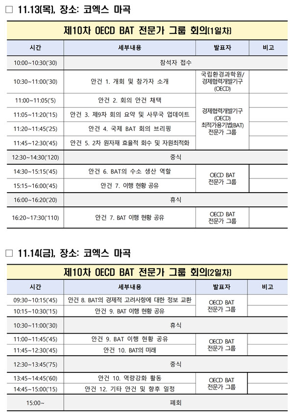 국립환경과학원은 이번 토론회의 후속 행사로 13일부터 이틀간 ‘제10차 경제협력개발기구(OECD) 최적가용기법 전문가 회의’를 코엑스 마곡(서울 강서구 소재)에서 진행할 계획이다.