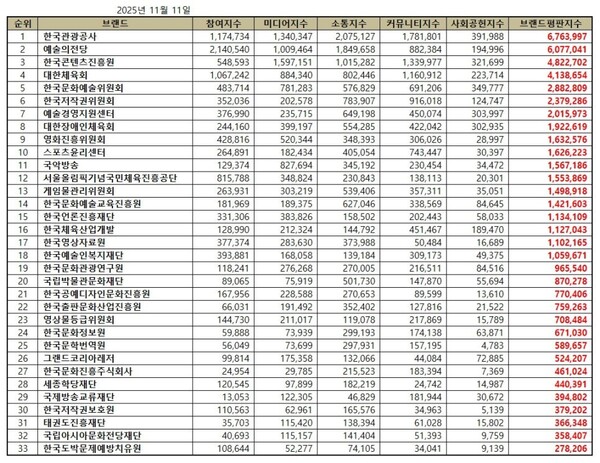한국기업평판연구소는 문화체육관광부 공공기관 33개 브랜드에 대해 2025년 10월 11일부터 2025년 11월 11일까지의 문화체육관광부 공공기관 브랜드 빅데이터 53,263,691개를 분석한 결과 지난 10월 문화체육관광부 공공기관 브랜드 빅데이터 54,982,785개와 비교하면 3.13% 줄어들었다고 밝혔다.