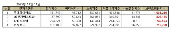 2025년 11월 전자유통점 브랜드평판 순위는 롯데하이마트, LG전자베스트샵, 삼성스토어, 전자랜드 순으로 나타났다.