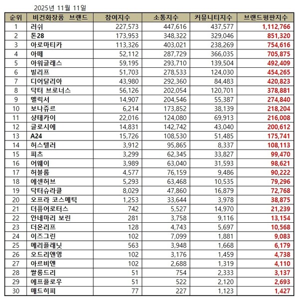 한국기업평판연구소는 국내 소비자에게 사랑받는 비건화장품 브랜드 30개에 대해 2025년 10월 11일부터 2025년 11월 11일까지의 비건화장품 브랜드 빅데이터 6,920,057개를 분석한 결과 지난 10월 비건화장품 브랜드 빅데이터 6,884,718개와 비교해보면 0.51% 증가했다고 밝혔다.