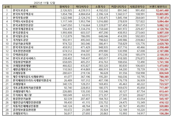 한국기업평판연구소는 국토교통부 공공기관 29개 브랜드에 대해 2025년 10월 12일부터 2025년 11월 12일까지의 국토교통부 공공기관 브랜드 빅데이터 77,192,512개를 분석한 결과 지난 10월 국토교통부 공공기관 브랜드 빅데이터 79,775,849개와 비교하면 3.24% 줄어들었다고 밝혔다.