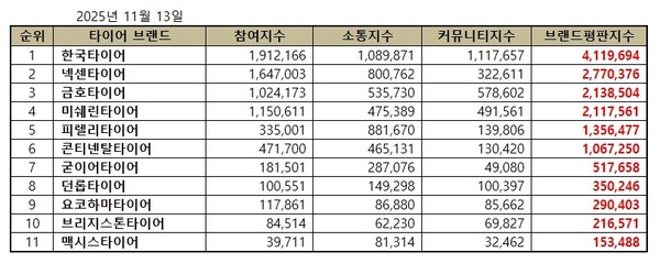 한국기업평판연구소는 2025년 10월 13일부터 2025년 11월 13일까지의 타이어 브랜드 빅데이터 15,098,228개를 분석한 결과 지난 10월 브랜드 빅데이터 14,462,491개와 비교하면 4.40% 증가했다고 밝혔다.