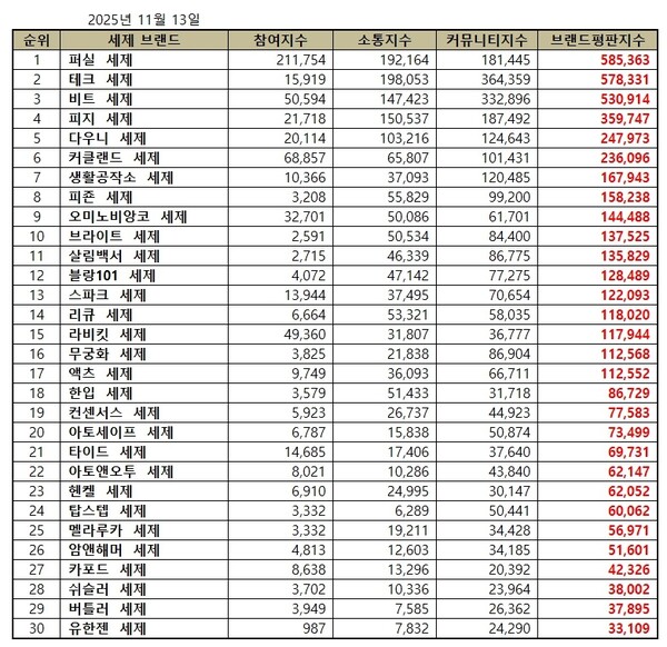 세제 2025년 11월 브랜드평판... 퍼실, 테크, 비트 順