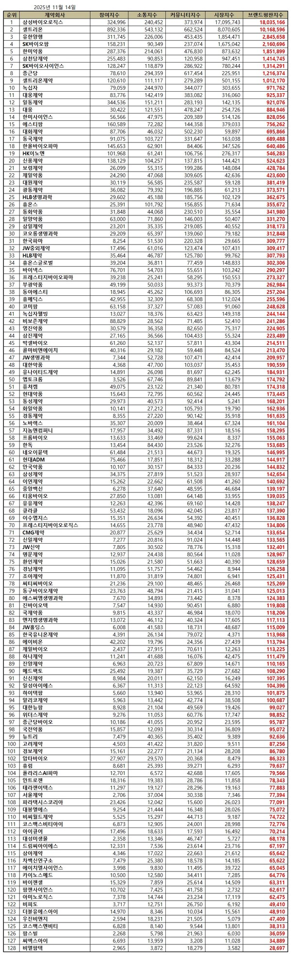 제약 상장기업 2025년 11월 브랜드평판...삼성바이오로직스, 셀트리온, 유한양행 順