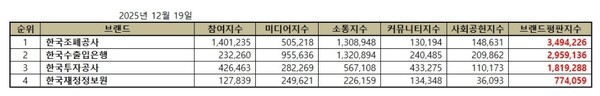 기획재정부 공공기관 2025년 12월 브랜드평판...한국조폐공사, 한국수출입은행, 한국투자공사 順