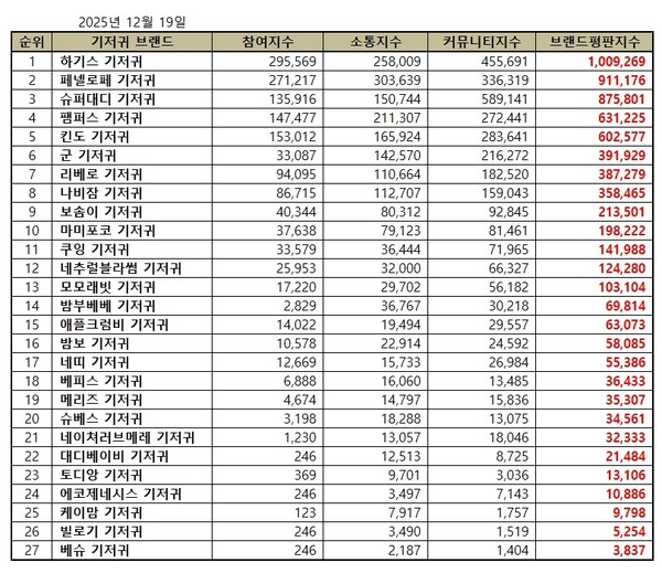한국기업평판연구소는 국내 소비자에게 사랑받는 기저귀 브랜드 27개에 대해 2025년 11월 19일부터 2025년 12월 19일까지의 기저귀 브랜드 빅데이터 6,398,174개를 분석한 결과 지난 11월 기저귀 브랜드 빅데이터 6,326,156개와 비교하면 1.14% 증가했다고 밝혔다.