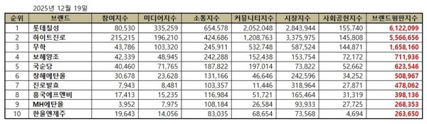 음료 상장기업 2025년 12월 브랜드평판...롯데칠성, 하이트진로, 무학 順