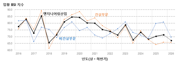 기술 부문별 업황 분석을 보면, 먼저 건설은 올해 상반기 64.2에서 하반기 65.9로 소폭 상승했으나, 공공 부문 예산 조정 및 일부 사업의 발주 지연의 지속으로 2026년 상반기에는 65.7로 소폭 조정될 것으로 전망된다. 비건설은 상반기 79.8 대비 하반기 80.7로 소폭 상승했으나, 내년 상반기 69.6으로 하락할 전망이다.
