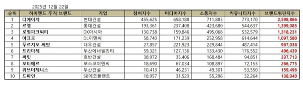 한국기업평판연구소는 10개 하이엔드 주거 브랜드에 대해 2025년 11월 22일부터 2025년 12월 22일까지의 국내 하이엔드 주거 브랜드 빅데이터 8,779,263개를 분석한 결과 지난 11월 하이엔드 주거 브랜드 빅데이터 9,583,436개와 비교하면 8.39% 줄어들었다고 밝혔다.