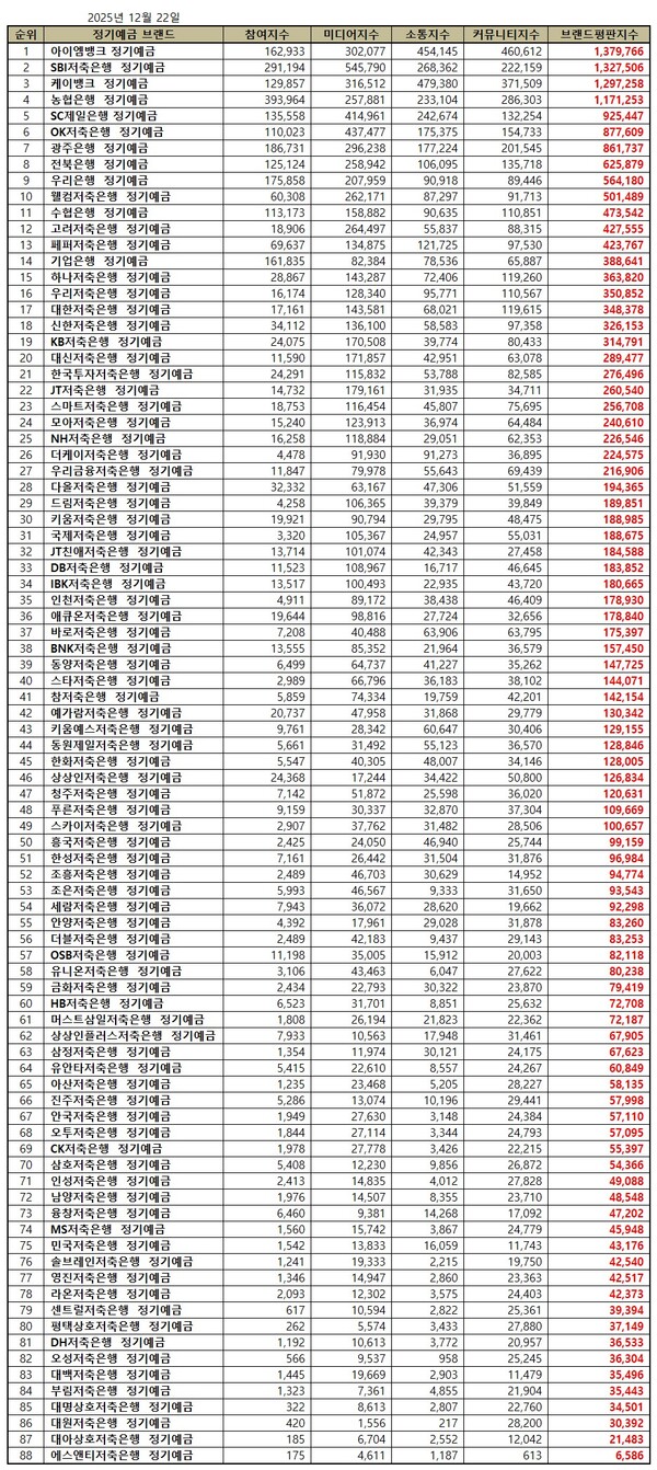 한국기업평판연구소는 88개 정기예금 브랜드에 대해 2025년 11월 22일부터 2025년 12월 22일까지의 정기예금 브랜드 빅데이터 20,592,263개를 분석한 결과 지난 11월 정기예금 브랜드 빅데이터 19,451,036개와 비교하면 5.87% 증가했다고 밝혔다.