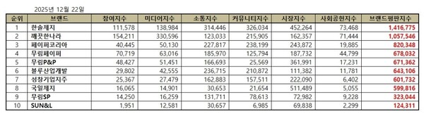 5위, 무림P&P 브랜드는 참여지수 48,427 미디어지수 51,451 소통지수 166,693 커뮤니티지수 25,569 시장지수 361,991 사회공헌지수 17,231이 되면서 브랜드평판지수 671,362로 분석됐다. 지난 11월 브랜드평판지수 627,801과 비교해보면 6.94% 상승했다.