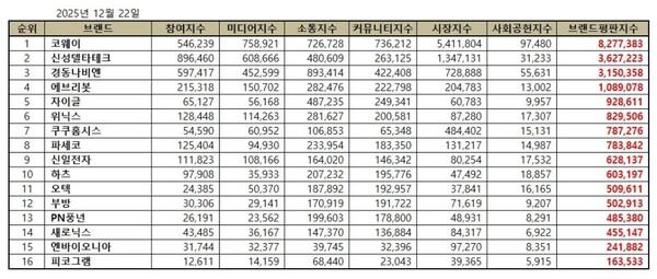 2025년 12월 가정용품 상장기업 브랜드평판 순위는 코웨이, 신성델타테크, 경동나비엔, 에브리봇, 자이글, 위닉스, 쿠쿠홈시스, 파세코, 신일전자, 하츠, 오텍, 부방, PN풍년, 새로닉스, 엔바이오니아, 피코그램 순으로 분석됐다.