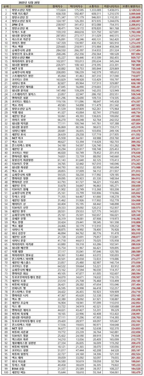 한국기업평판연구소는 2025년 11월 20일부터 2025년 12월 20일까지 보이그룹 개인 755명의 브랜드 빅데이터 55,502,285개를 추출하여 보이그룹 개인 브랜드에 대한 소비자들 행동분석을 가지고 만든 참여지수, 미디어지수, 소통지수, 커뮤니티지수로 브랜드평판지수를 분석한 결과 지난 11월 보이그룹 브랜드 빅데이터 67,621,811개와 비교하면 17.92% 줄어들었다고 밝혔다.