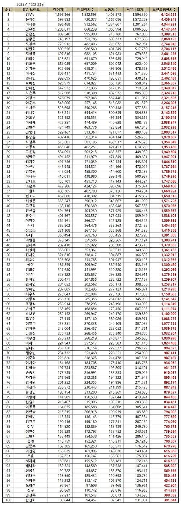 한국기업평판연구소는 2025년 11월 23일부터 2025년 12월 23일까지 방영한 드라마, 영화, OTT에서 출연중인 배우 100명의 브랜드 빅데이터 155,394,225개를 소비자들의 브랜드 참여량, 미디어량, 소통량, 커뮤니티량으로 측정하여 브랜드평판 알고리즘으로 지수화한 결과 지난 11월 배우 브랜드 빅데이터 141,335,073개와 비교하면 9.95% 증가했다고 밝혔다.