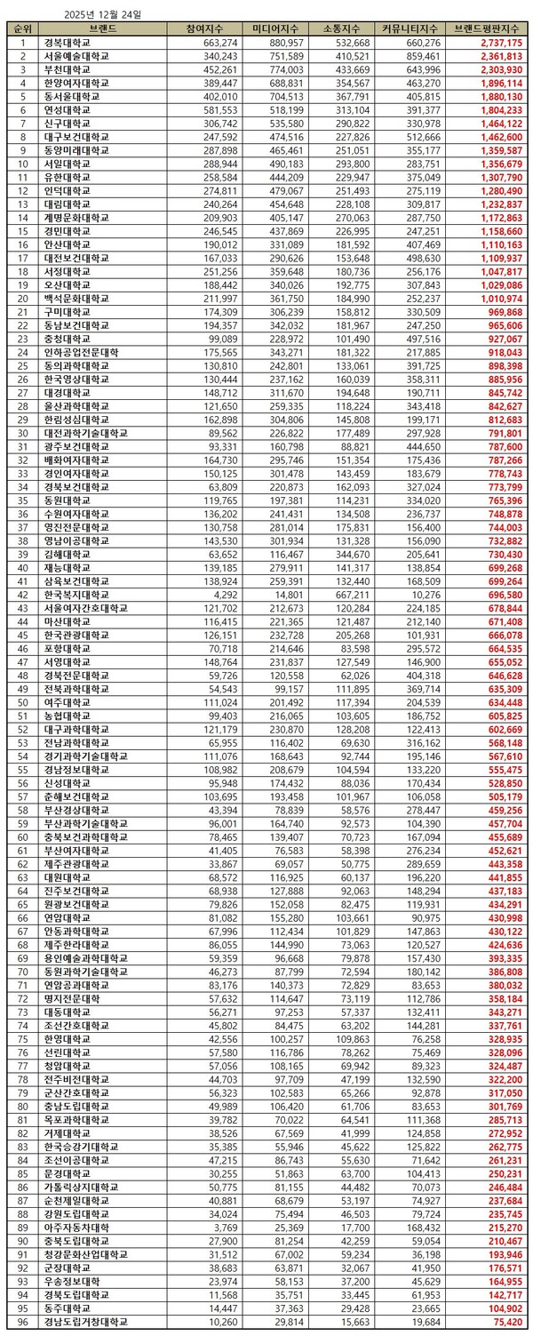 한국기업평판연구소는 2025년 11월 24일부터 2025년 12월 24일까지의 전문대학 브랜드 빅데이터 69,401,662개를 분석한 결과 지난 11월 전문대학 브랜드 빅데이터 84,678,154개와 비교하면 18.04% 줄어들었다고 밝혔다.