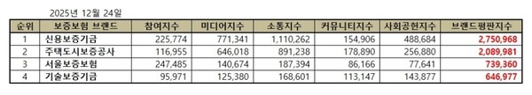 보증보험 2025년 12월 브랜드평판...신용보증기금, 주택도시보증공사, 서울보증보험 順