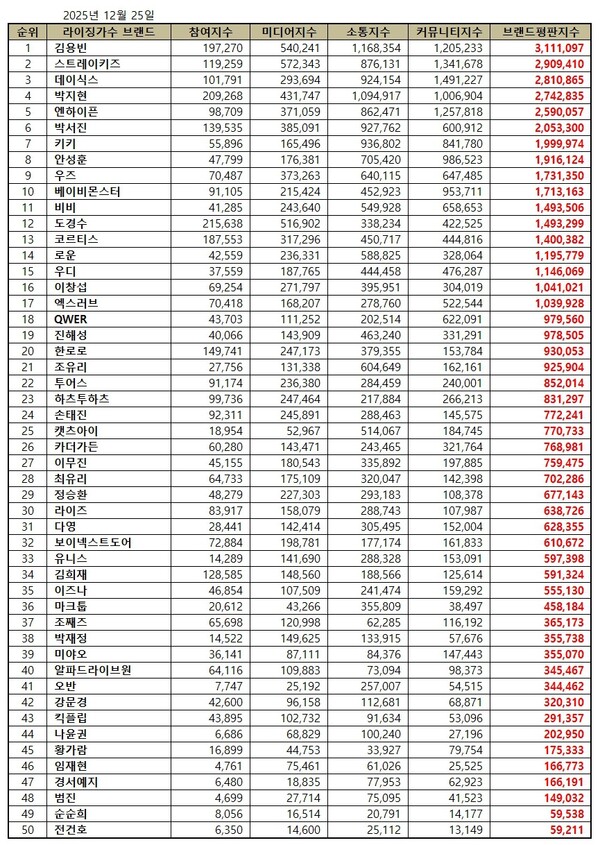 라이징 가수 2025년 12월 브랜드평판...김용빈, 스트레이키즈, 데이식스 順