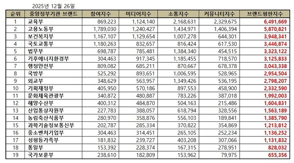 대한민국 중앙정부기관 2025년 12월 브랜드평판...교육부, 고용노동부, 보건복지부 順