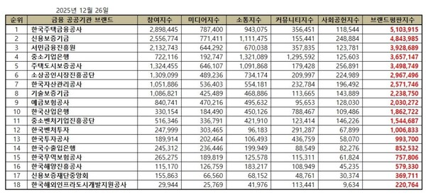 한국기업평판연구소는 금융 공공기관 18개 브랜드에 대해 2025년 11월 26일부터 2025년 12월 26일까지의 금융 공공기관 브랜드 빅데이터 39,028,836개를 분석한 결과 지난 11월 금융 공공기관 브랜드평판 빅데이터 38,163,469개와 비교해보면 2.27% 증가했다고 밝혔다.
