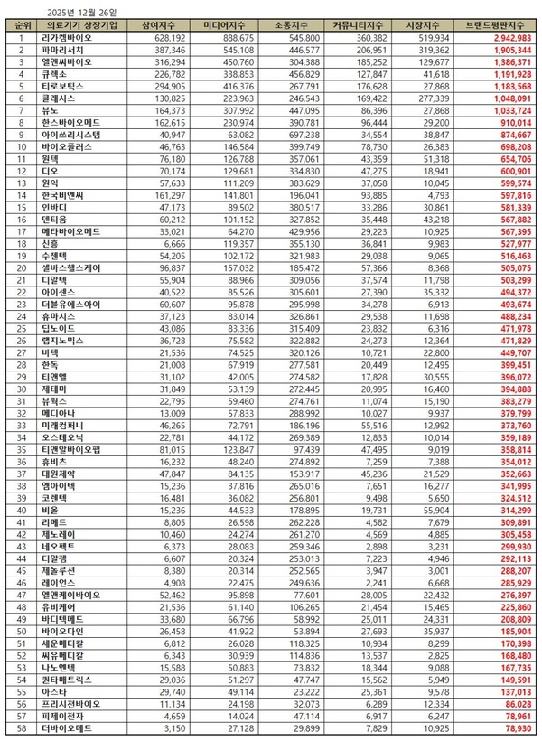 의료기기 상장기업 2025년 12월 브랜드평판...리가켐바이오, 파마리서치, 엘앤씨바이오 順
