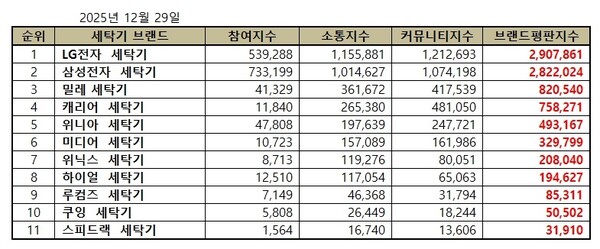 세탁기 2025년 12월 브랜드평판...LG전자, 삼성전자, 밀레 順
