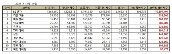 전자제품 상장기업 2025년 12월 브랜드평판...LG전자, 가온그룹, 아남전자 順