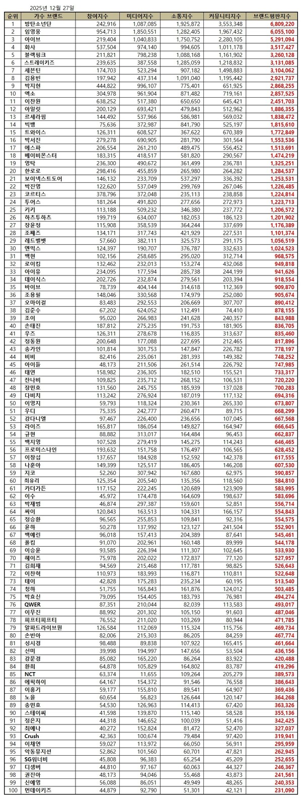 한국기업평판연구소는 2025년 11월 27일부터 2025년 12월 27일까지의 가수 브랜드 빅데이터 108,476,322개를 분석한 결과 지난 11월 가수 브랜드 빅데이터 128,963,307개와 비교하면 15.89% 줄어들었다고 밝혔다.