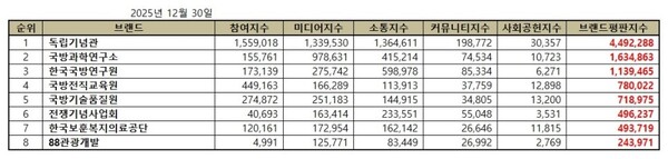 한국기업평판연구소는 국방보훈 관련 공공기관 8개 브랜드에 대해 2025년 11월 30일부터 2025년 12월 30일까지의 국방보훈 공공기관 브랜드 빅데이터 9,999,538개를 분석한 결과 지난 9월 국방보훈 공공기관 브랜드 빅데이터 10,342,386개와 비교하면 3.31% 줄어들었다고 밝혔다.