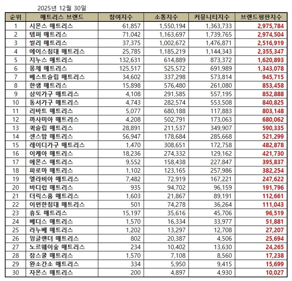 2025년 12월 매트리스 브랜드평판 순위는 시몬스, 템퍼, 씰리, 에이스침대, 지누스, 몽제, 베스트슬립, 한샘, 삼익가구, 동서가구, 리바트, 까사미아, 퀵슬립, 센스맘, 레이디가구, 이케아, 에몬스, 파로마, 엘라비아, 바디럽, 더릭스홈, 이편한침대, 휴도, 베디스, 라누베, 잉글랜더, 노르웨이숲, 잠스쿨, 완소간소, 자몬스 매트리스 순으로 분석됐다.