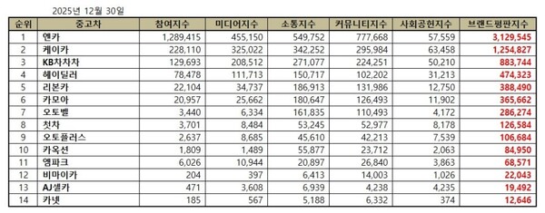 2025년 12월 중고차 브랜드평판 순위는 엔카, 케이카, KB차차차, 헤이딜러, 리본카, 카모아, 오토벨, 첫차, 오토플러스, 카옥션, 엠파크, 비마이카, AJ셀카, 카넷 순으로 나타났다.