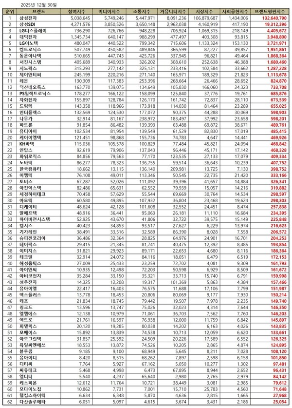 스마트폰 관련 상장기업 브랜드평판 2025년 12월 빅데이터 분석 30위 순위는 삼성전자, 삼성SDI, LG디스플레이, 대덕전자, LG이노텍, 켐트로닉스, 동운아나텍, 서진시스템, 시노펙스, 제이앤티씨, 레몬, 덕산네오룩스, PS일렉트로닉스, 자화전자, 드림텍, 인터플렉스, 나무가, 파트론, 유티아이, 케이이엠텍, KH바텍, 인탑스, 파워로직스, 노바텍, 한국컴퓨터, 이엠텍, 토비스, 아진엑스텍, 세경하이테크, 아모텍 순이었다.