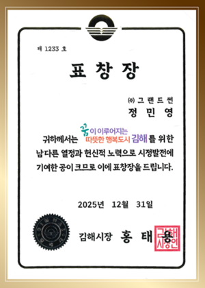 정민영 그랜드썬 대표이사는 “이번 표창은 기업 혼자만의 성과가 아니라, 지역사회와 함께 만들어 온 결과라고 생각한다”며 “김해는 그랜드썬이 지속적으로 관심을 두고 함께해 온 지역인 만큼, 앞으로도 지역에 실질적인 도움이 되는 사회공헌 활동을 이어가겠다”고 밝혔다.