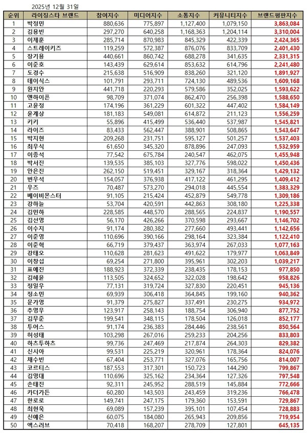 2025년 12월 라이징 스타 브랜드평판 30위 순위는 박정민, 김용빈, 이제훈, 스트레이키즈, 장기용, 이준호, 도경수, 데이식스, 원지안, 엔하이픈, 고윤정, 윤계상, 키키, 라이즈, 박지현, 최우식, 이종석, 박서진, 안은진, 변우석, 우즈, 베이비몬스터, 강하늘, 김민하, 김선영, 이수지, 이준영, 이준혁, 강태오, 이창섭 순으로 분석됐다.