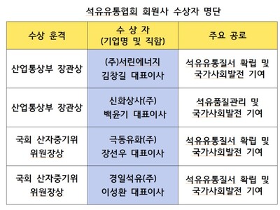 이들 4곳의 회원사 대표들은 투철한 사명감과 책임경영을 바탕으로 석유유통질서 확립과 산업 경쟁력 제고에 힘써 왔으며 국가사회 발전에 기여한 공로를 인정받았다.