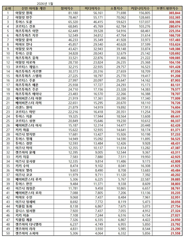 2026년 1월 신인 아이돌 개인 브랜드평판 30위 순위는 아일릿 원희, 아일릿 민주, 투어스 도훈, 코르티스 건호, 하츠투하츠 이안, 하츠투하츠 지우, 아일릿 윤아, 미야오 안나, 아일릿 모카, 투어스 신유, 하츠투하츠 유하, 아일릿 이로하, 코르티스 제임스, 하츠투하츠 카르멘, 하츠투하츠 스텔라, 코르티스 주훈, 하츠투하츠 예온, 하츠투하츠 주은, 하츠투하츠 에이나, 베이비몬스터 아현, 베이비몬스터 라미, 리센느 원이, 코르티스 마틴, 투어스 지훈, 코르티스 성현, 베이비몬스터 아사, 키키 하음, 이즈나 방지민, 투어스 영재, 투어스 경민 순으로 분석됐다.